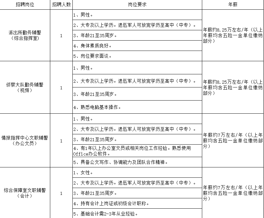 警務輔助人員年薪參考上述表格。對錄用擬聘用人員簽訂聘用合同,實行合同管理。年薪均包含五險一金單位繳納部分。報名聯(lián)系方式